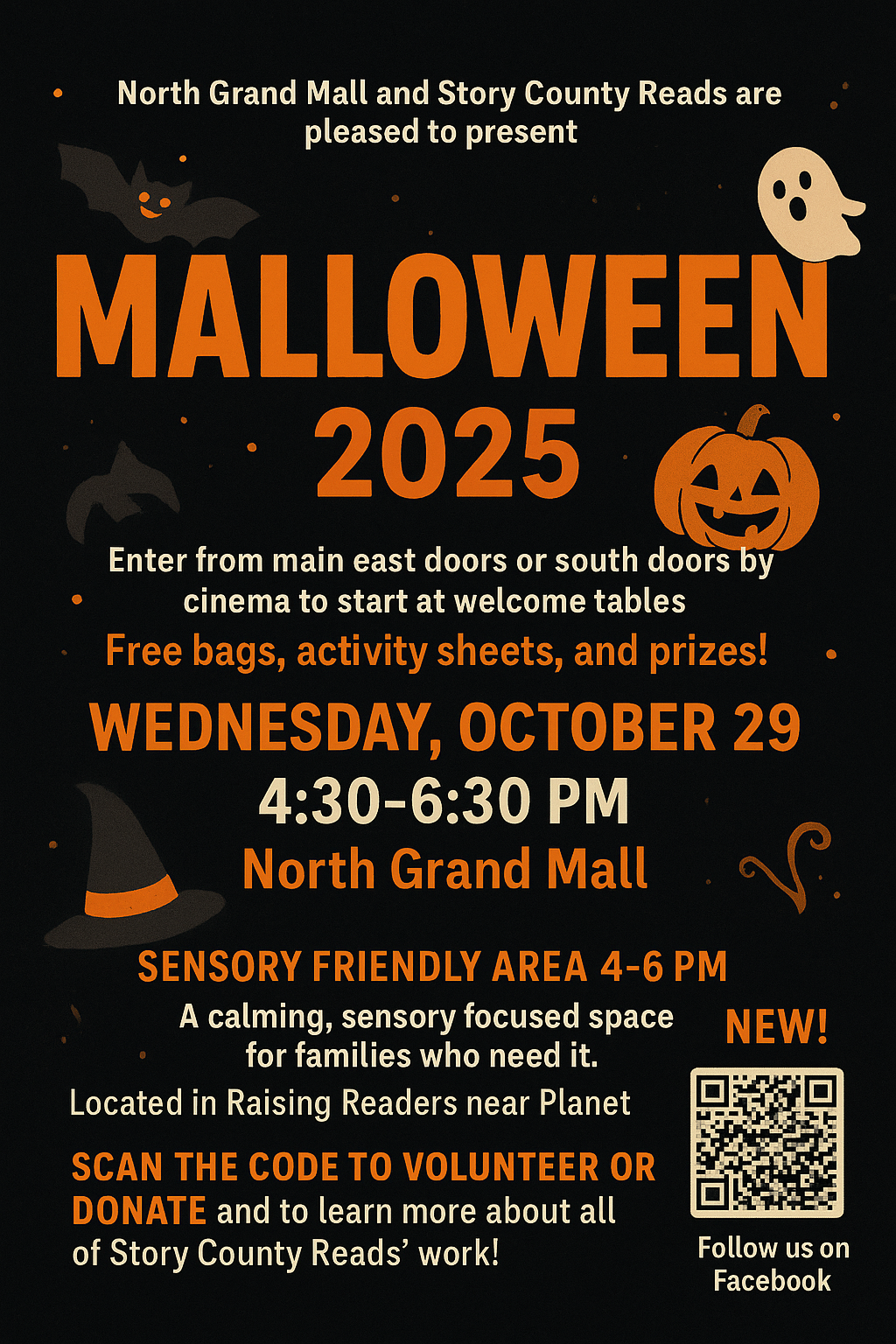 Join us at North Grand Mall for a Spooktacular time! Malloween is a fun, safe and warm environment to Trick or Treat! While you’re here, stop by the tables in the main hallway for fun activities, hand outs and learning tools! Malloween is a partnership between North Grand Mall, United Way of Story County, and Story County Reads.